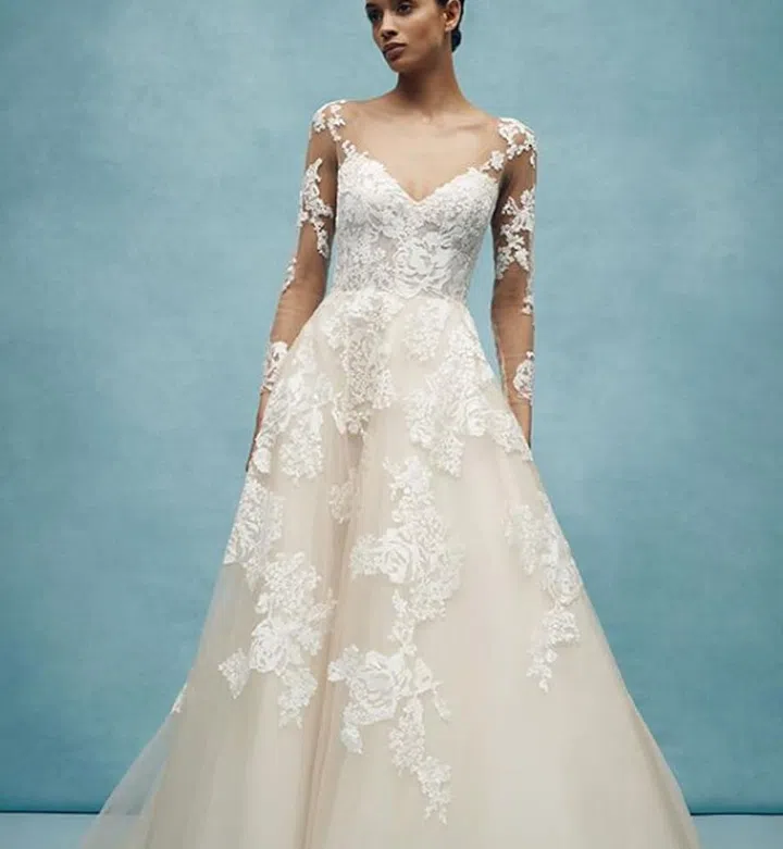 You can't go wrong with a classic princess gown. But this gorgeous Anne Barge dress is far from overly-conservative with ultra-sheer sleeves and a neckline that puts your decolletage on display.