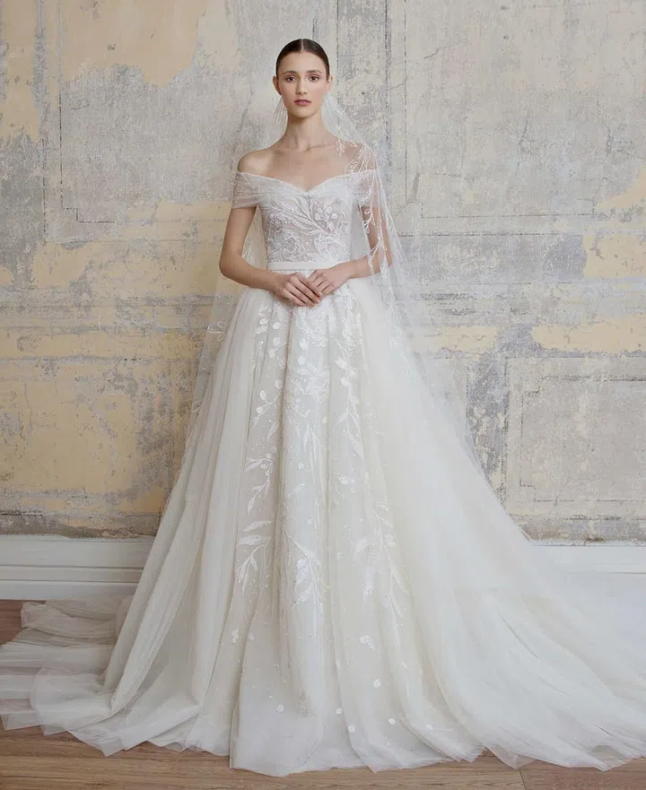Sheer off-shoulder straps with intricate beading across a see-through bodice make for a fairy tale gown for the modern bride - with a nude lining, of course.