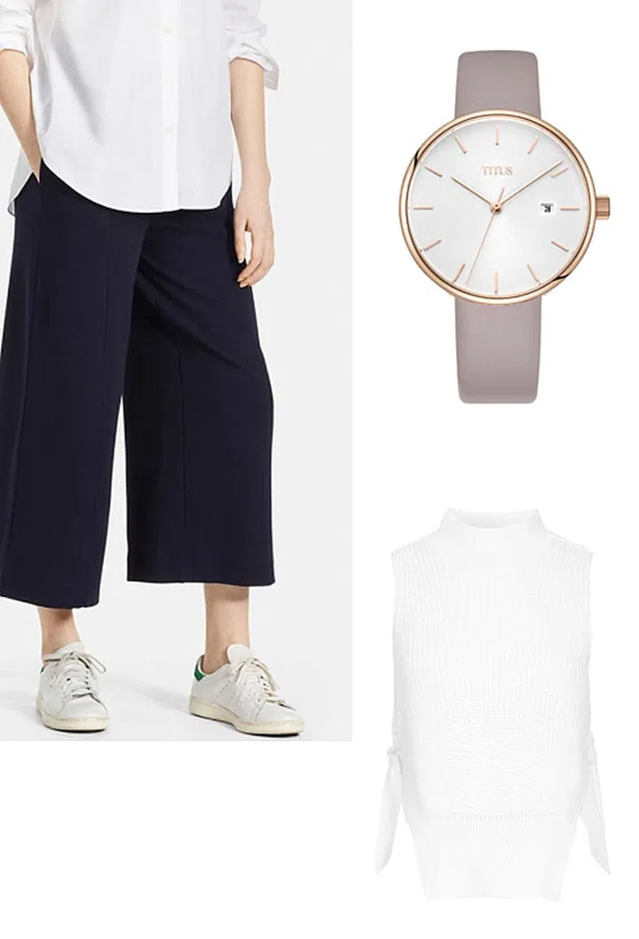 Ankle wide pants, $19.90 by Uniqlo; watch, price unavailable by Solvil et Titus; sleeveless tie side tank top, $66.90 by Topshop