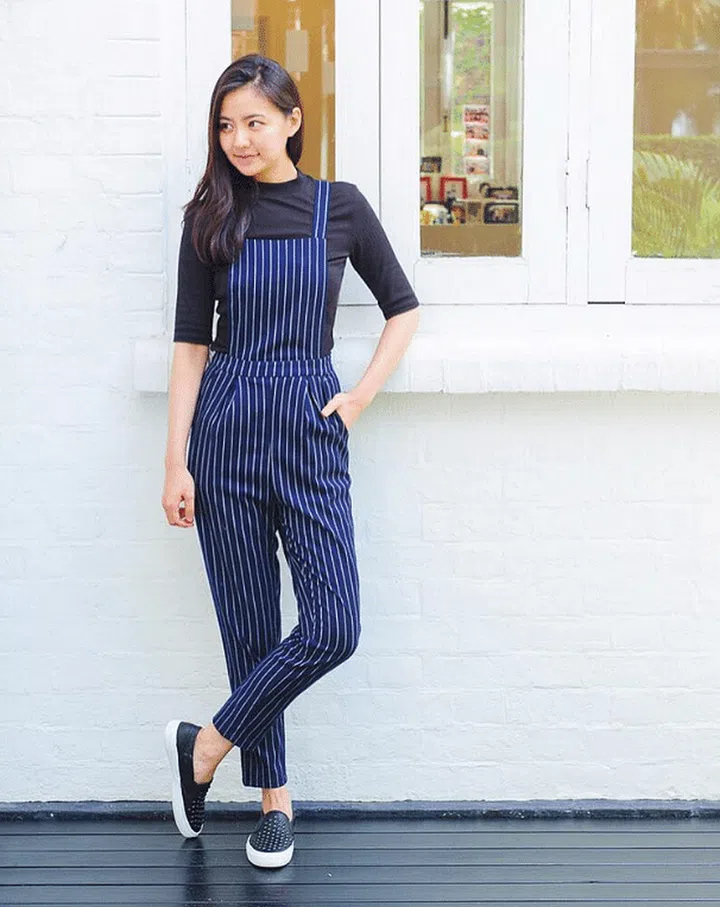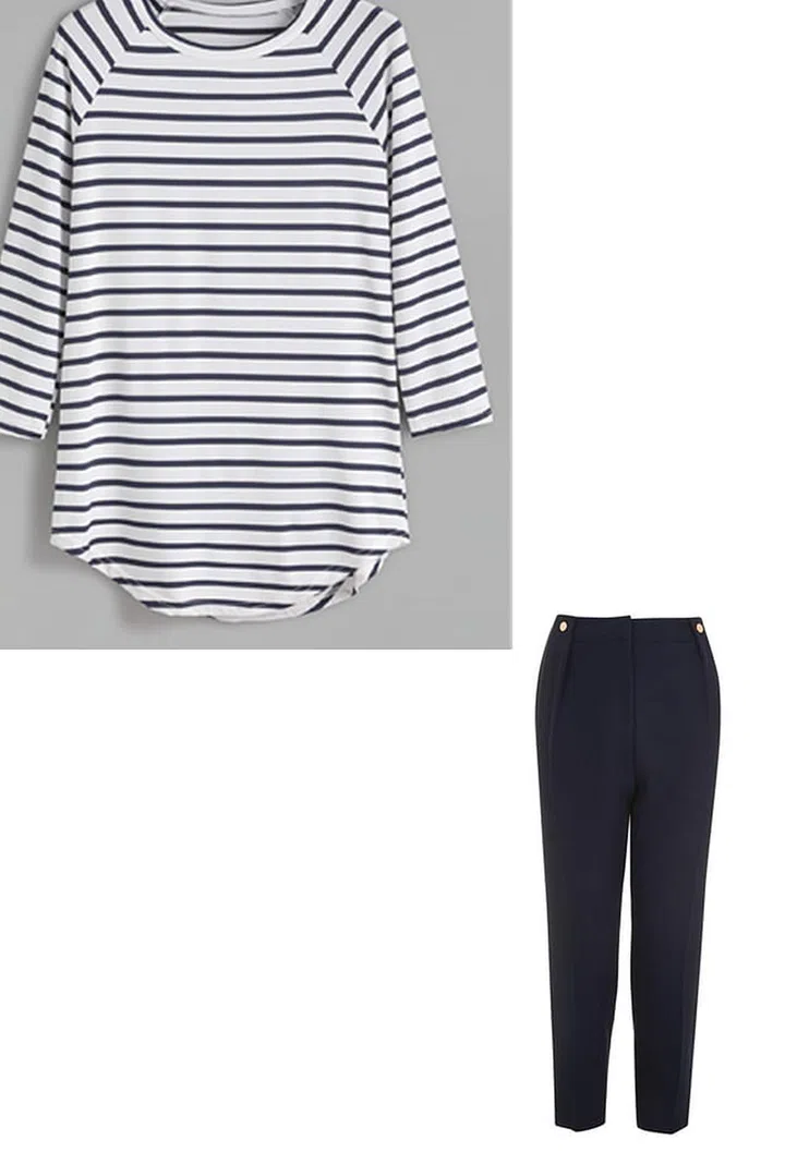 For the days when you’re out of time to plan what to wear, always reach for this foolproof ensemble – a striped t-shirt and navy pants.