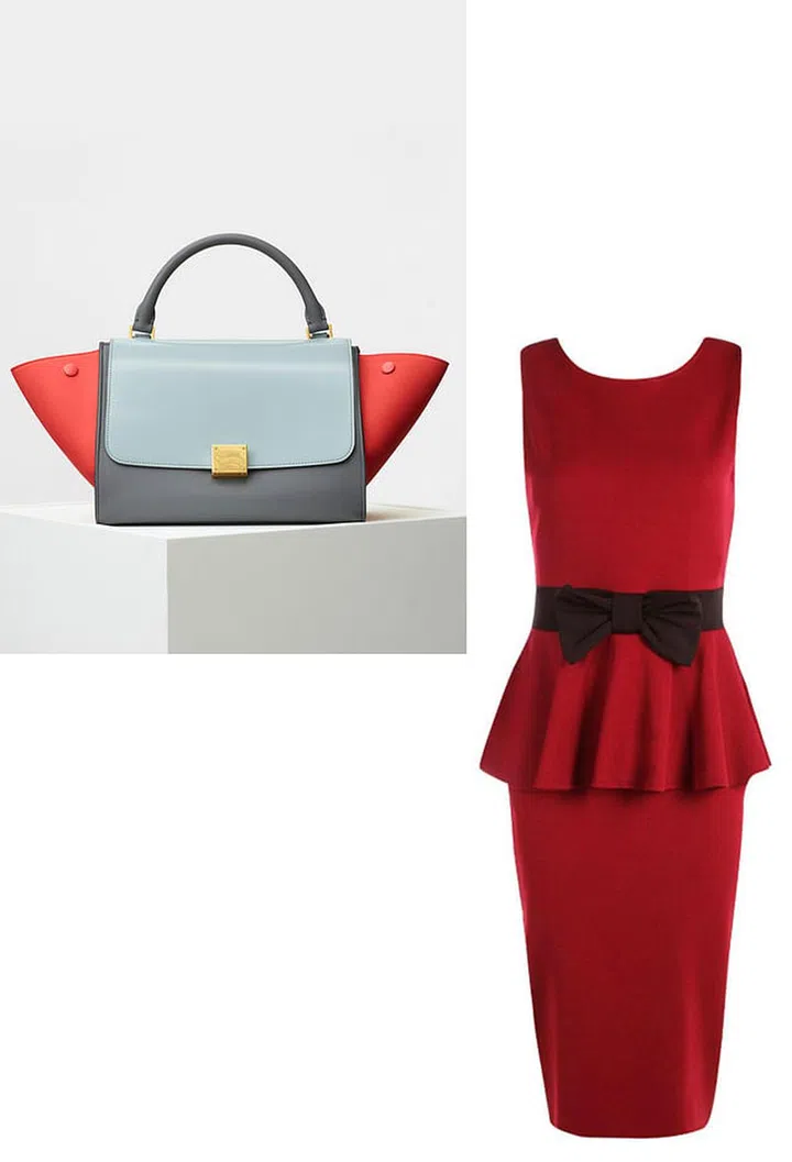 Small Trapeze handbag, price unavailable by Céline; peplum dress, $35 by Sarah Bow at BooHoo;