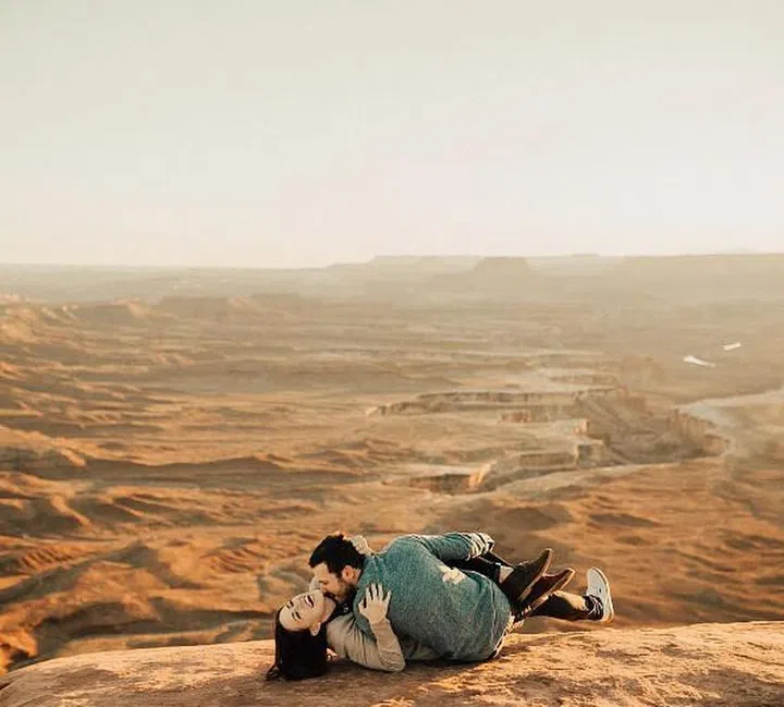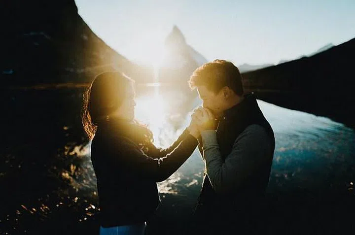 The lens flare and soft corner lighting throws a warm glow over this close-up shot, enhancing the sense of intimacy and love between the couple.