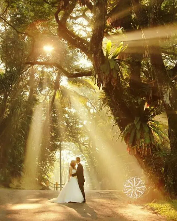 Shadowplay and panels of sun light cast an enchanting light over the couple!