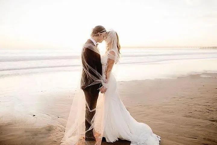 Beachside bridal portraits are the best for capturing the last light of dusk. We love how the full length veil adds the loveliest touch of softness and romance to the entire scene.