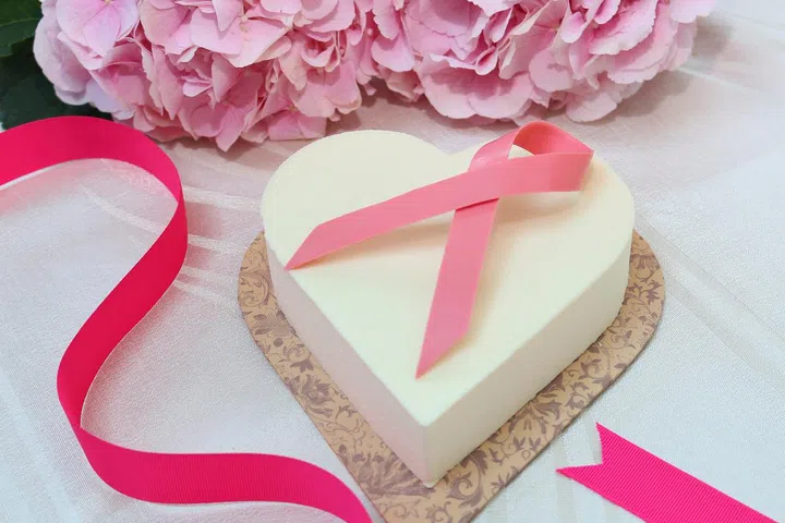 Topped with a chocolate pink ribbon, this lovely heart-shaped cake is strawberry flavoured with vanilla sponge and frosted with a cloud of yuzu cream and delicate lemon caviar. For each cake sold, $3.80 will be donated to BCF.