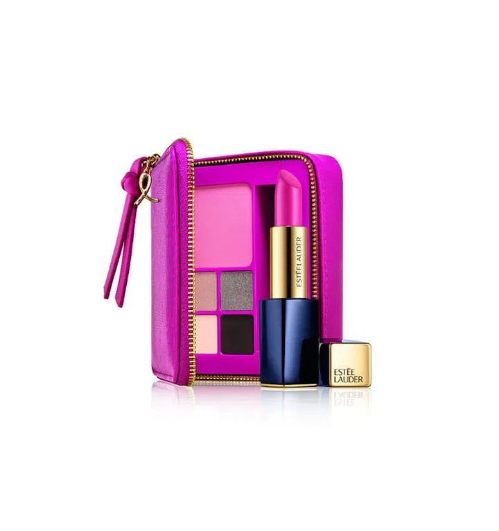 The set contains a makeup palette with four Pure Color Envy Eye Shadows, one Pure Color Envy Blush, and one full-size Pure Color Envy Lipstick, all tucked into a case. For every set sold, $10 goes to the BCRF.