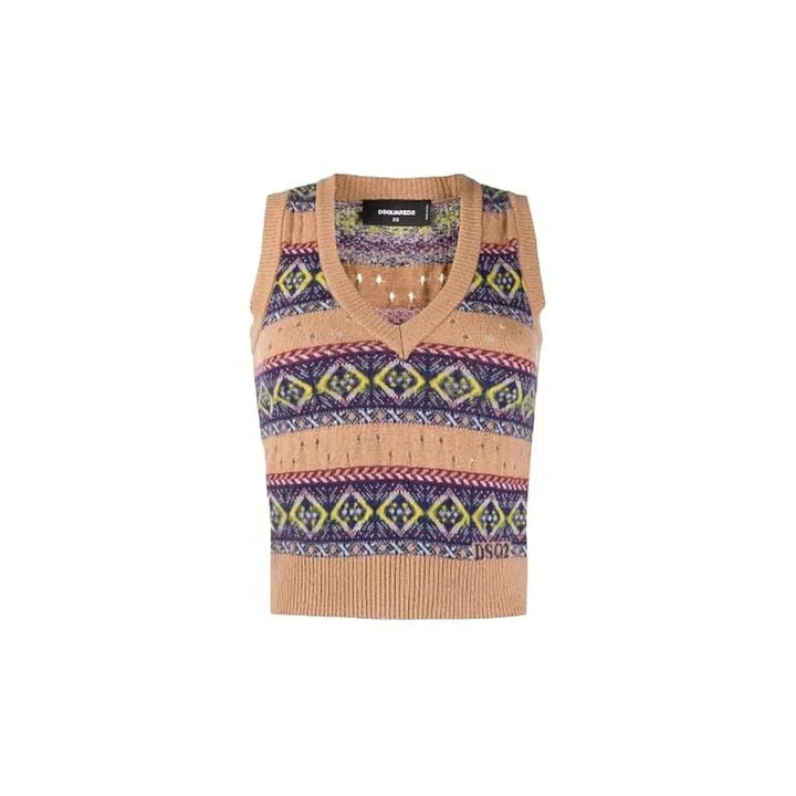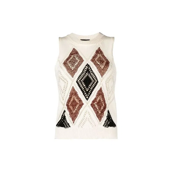 Give your ensemble a vintage spin with this patterned V-neck sweater vest by putting it over a white-collared shirt and a mini tartan skirt.