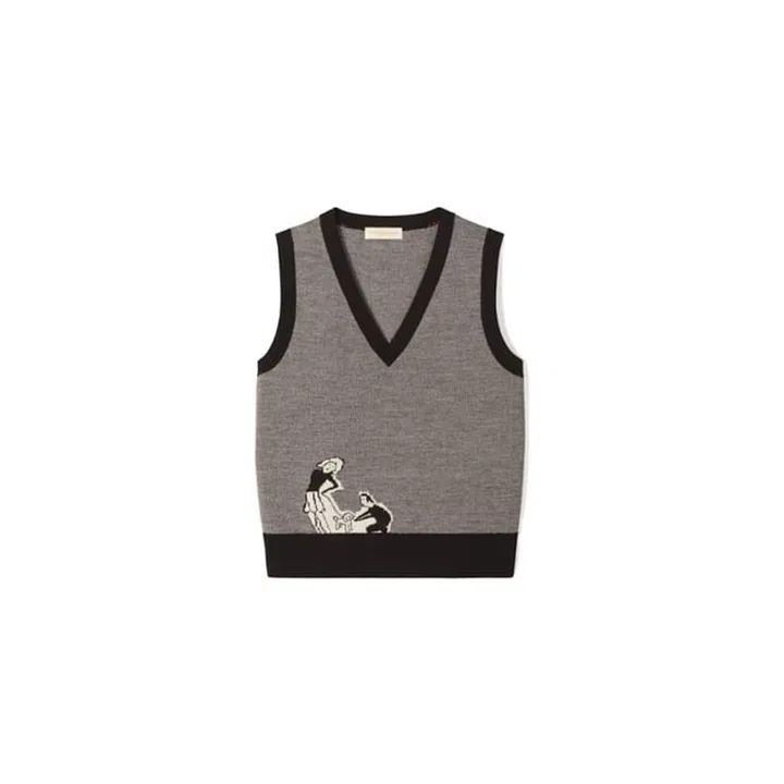 Taking references from ’70s sportswear with its shrunken size, this Tory Burch vest features a charming illustration of a family with their beloved dogs.
