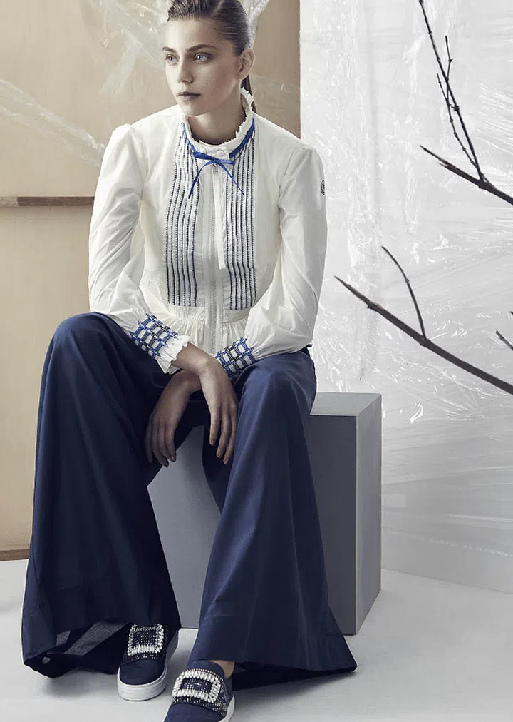 Nylon jacket with embroidery from Moncler. Polyester-blend wide-legged pants from Cos. Sneaky Viv denim slip-ons with crystal embellishments from Roger Vivier.