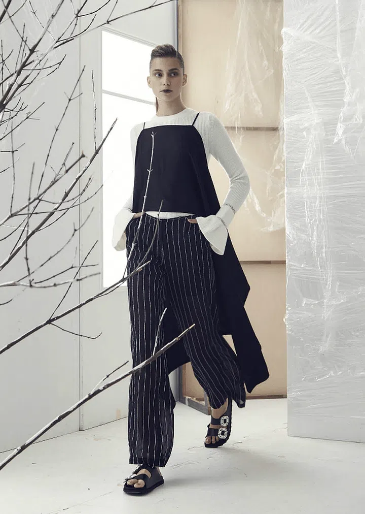 Cotton-blend knitted pullover from Iris & Ink. Silk satin camisole with train and silk chiffon pinstripes pants from DKNY. Slidy Viv leather sandals with crystals embellishments from Roger Vivier.
