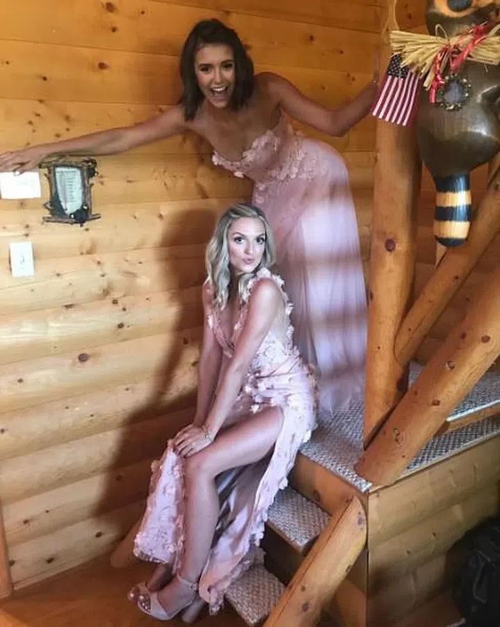 Actress Nina Dobrev was gorgeous in this blush pink bustier dress with floral embroidery as bridesmaid for Julianne Hough’s rustic outdoor wedding.