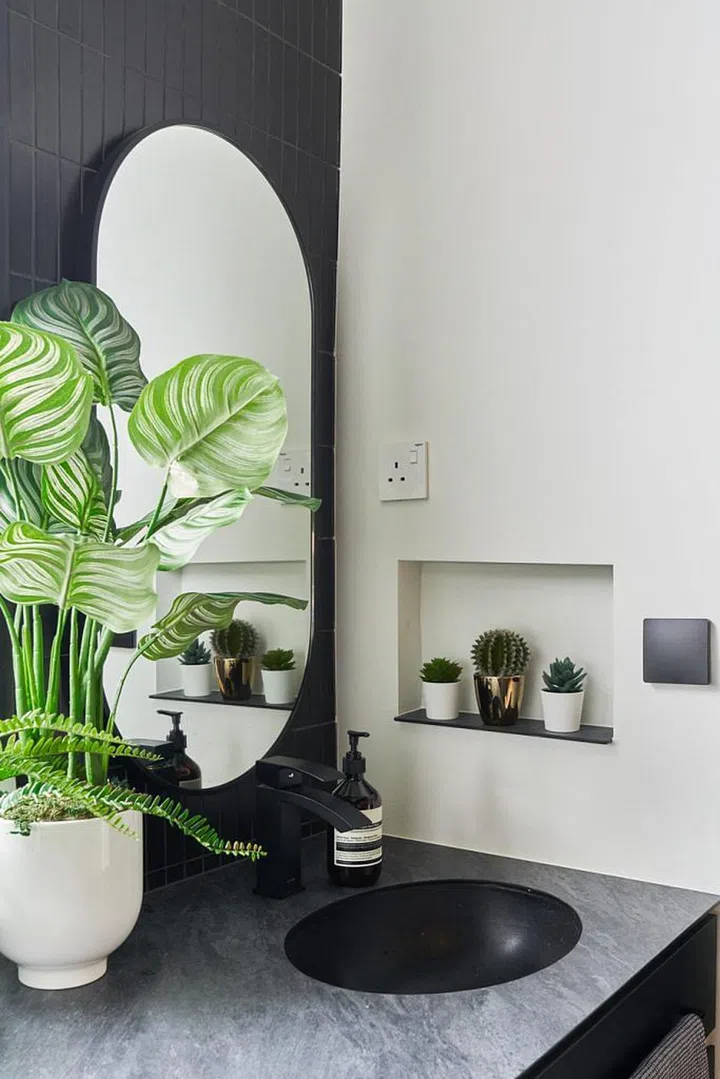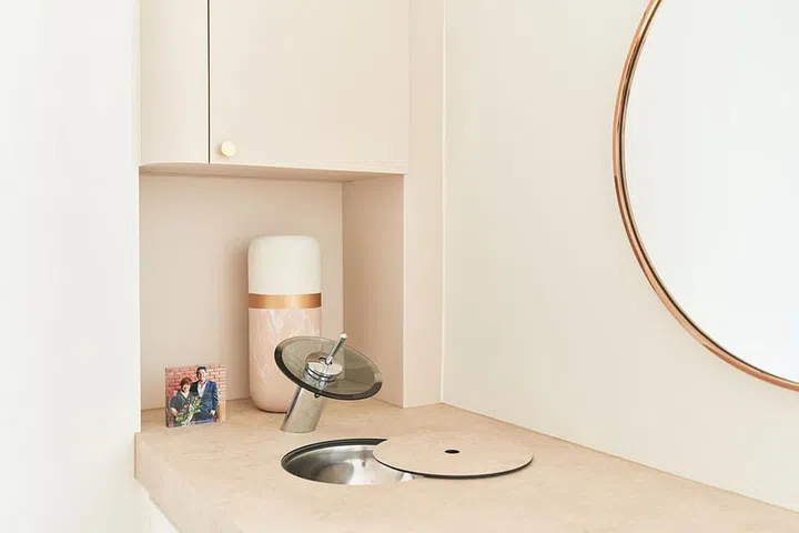 The same principle applies in the bathroom, where niches are carved into walls to store small items.
