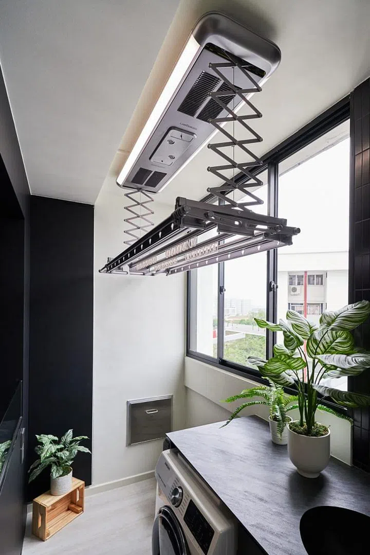 Next to the kitchen is the open pantry/yard area, which features a sleek, retractable laundry system, which can extend and retract as needed. It also comes with a lighting system that helps with the indoor drying.