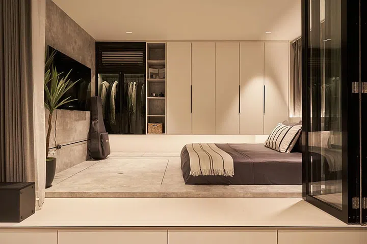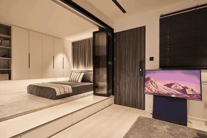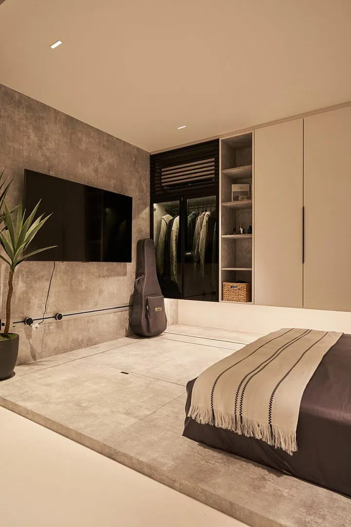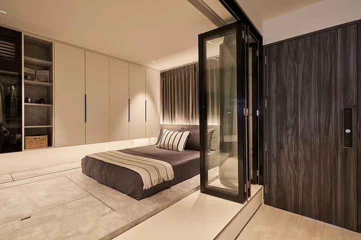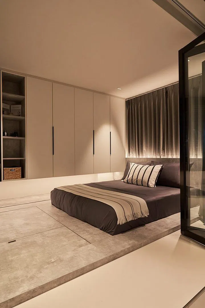 Shuwen managed to retain the linearity of the interior for a clean-cut modern look by neatly placing the storage into walls and raised platforms, as seen in Aiken’s bedroom. The platform of his bedroom is raised by 30cm, creating more space for storage.
