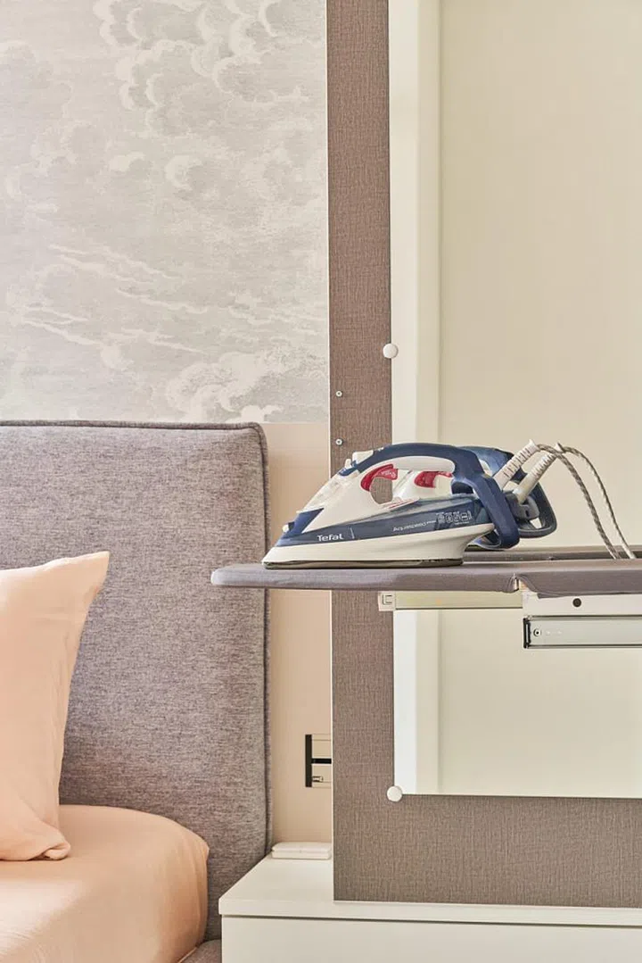 The ironing board is integrated into the wardrobe via a pull-out mechanism that can be easily slid inside when not needed, leaving the space tidy in a jiffy.