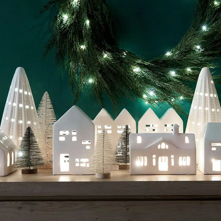 For fancier options, Crate & Barrel offers glass drop ornaments, adorable hand-knit bibelots, ceramic Christmas trees, and exquisite berry wreaths that add a rustic touch to any interior. Its more affordable range of decorations include individual ornaments priced at $2.85, and a set of two tree ramekins that cost $20.85.