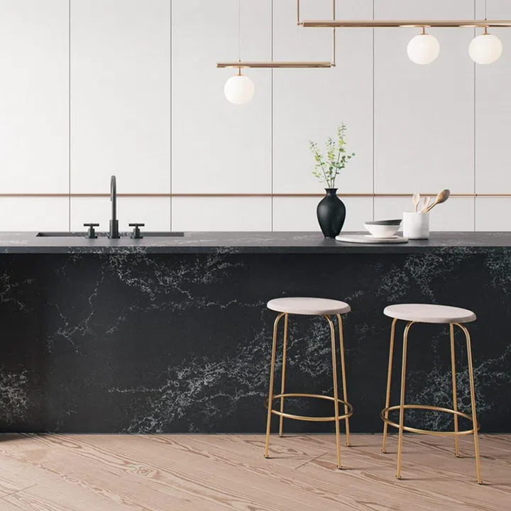 Also called engineered stone, composite stone countertops look very much like their natural counterparts, but are in fact compressed slabs. These usually stand up well to the test of time, since their non-porosity makes them stain- and mould-resistant (read: easier cleanups). We like the Black Tempal collection by Caesarstone, whose complex layers were inspired by the night sky and the ocean tides.