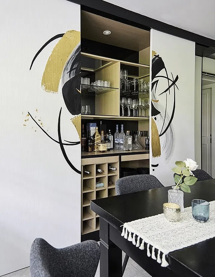 To prevent clutter, the previous homeowners had chosen to hide away the compact home bar with a pair of sliding doors. Homeowner Gayatri then hired a local muralist to add an abstract piece over the otherwise barren sliding doors.