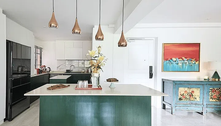 Homeowner Gayatri had bought over this 5-room HDB resale unit from its previous owners, opting to retain and design around most of its existing features, such as the two kitchen islands, tiles, the sliding bar in the dining room, and cabinet fixtures in the rooms.