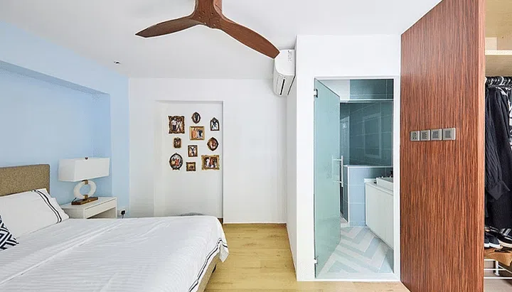 For Gayatri, coziness and comfort take precedence in the master bedroom. To achieve that, she kept things simple, using lighter shades of blue on some walls and white on the rest.