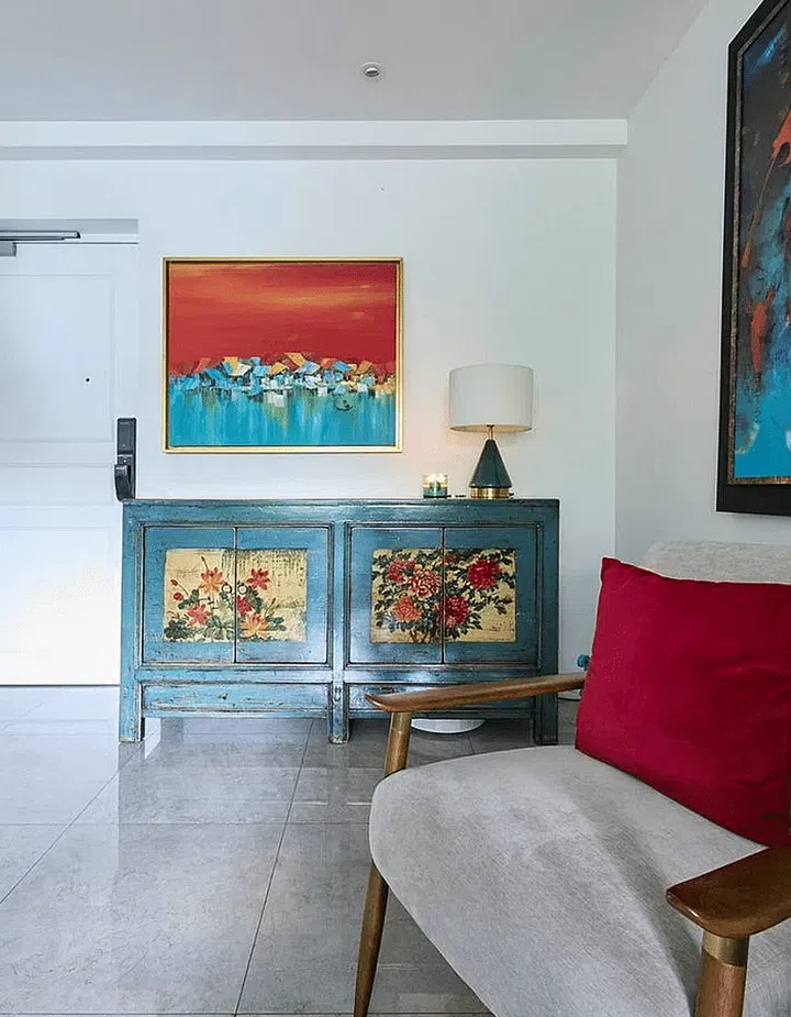 Homeowner Gayatri’s love for the arts is immediately evident in the home’s entryway that segues into the living room: a painting depicting a serene jetty at sunset is perched above a teal-colored vintage Chinese cabinet by the door; while other art pieces, including a commissioned artwork of a scarlet horse by an Indian artist, are hung on the living room’s walls.