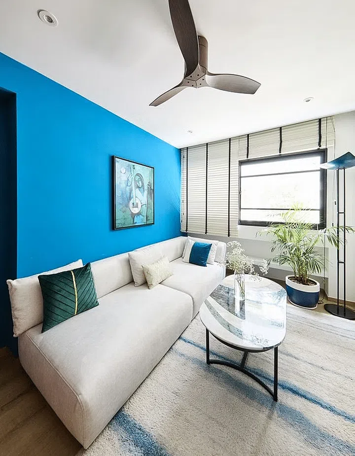 “I love blue, and you can see different shades of them in the entertainment lounge, the guest study and the master bedroom,” says Gayatri, as she shares how using a similar colour palette for the spaces where people “rest and slumber” could keep things cohesive and not feel all too instrusive.