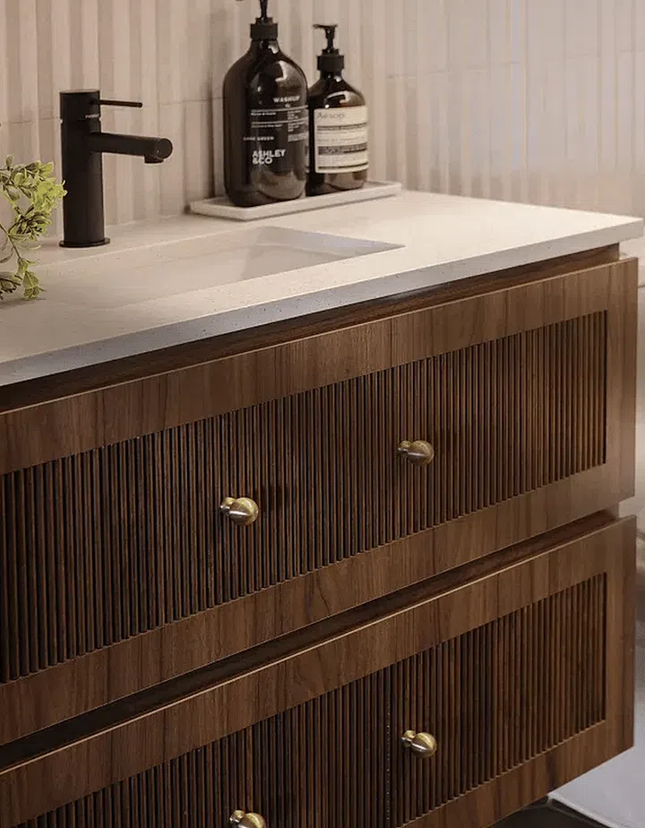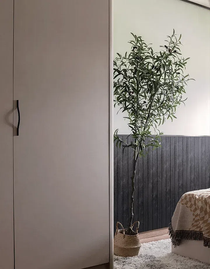 “An arch nook at the side of the L-shaped wardrobe helps soften the look of the carpentry when you first step into the room,” Melissa says, adding that it also serves as a practical storage area for frequently used accessories.