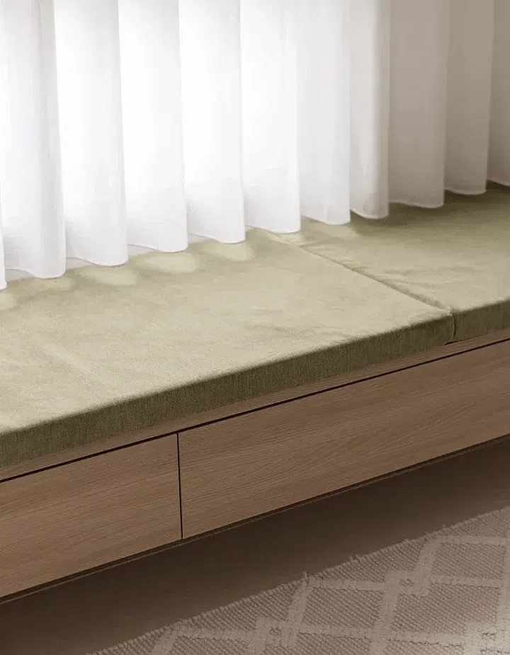 A floating bench stretches across the windows, adding more seating to the living area that is already occupied by ample sofas. Every element was measured carefully to ensure spatial flow, comfort and ease of movement.