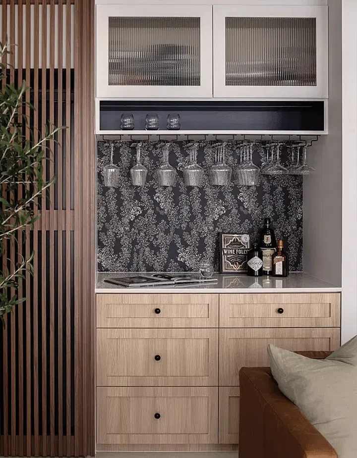 A compact home bar area beside the wine fridge offers plenty of storage space. Custom wallpaper adds flair to the space.