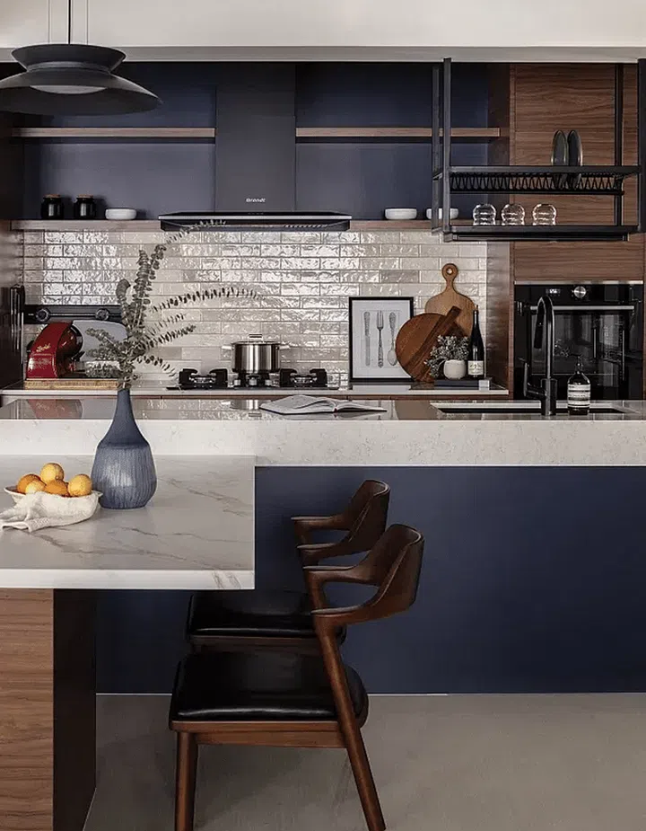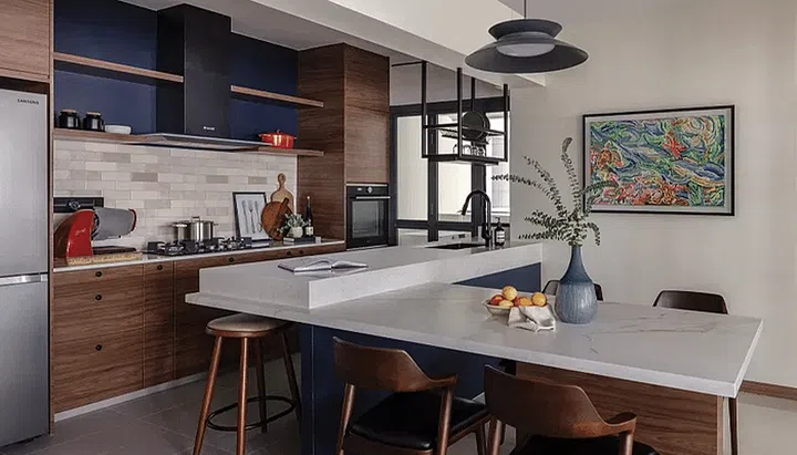 Instead, they preferred having plenty of seating options for hosting and a bar area to be fitted somewhere close. An open kitchen concept with ample countertop space was also in the brief.