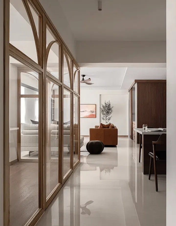 They also converted the bedroom closest to the living area into a study. Walls were removed so that it would feel like a part of the main living space. Glass doors with arch details provide a sense of continuity.