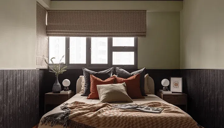 Finding a unique look for the master bedroom was also a vital task. The interior design team accomplished it with light green paint on all walls. Of note, flat wall panels in black clad the bottom half of the walls. The combination brings a sense of calm and cosiness while remaining cohesive with the rest of the home.