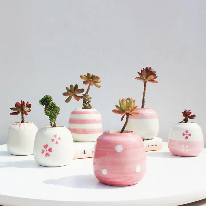 Adding plants, real or otherwise is the one of the easiest way to infuse biophilia into your space. This set of six small planters features a variety of hand-painted design in soft pink and white, lending a handmade touch to your space while providing vessel for your succulents and cacti.