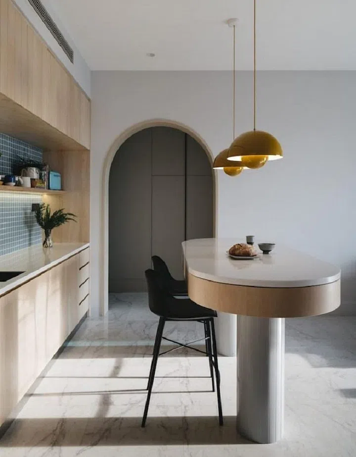 A wide arch here distinguishes the kitchen from the dining area while allowing spatial flow.