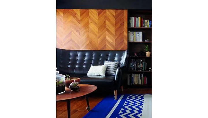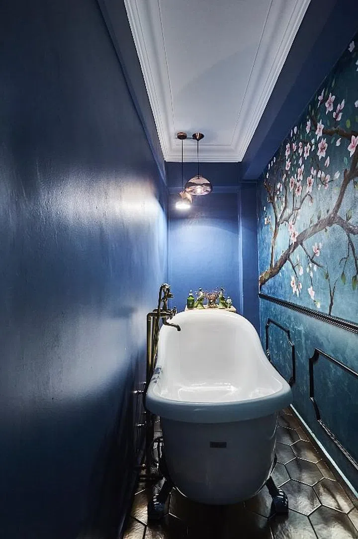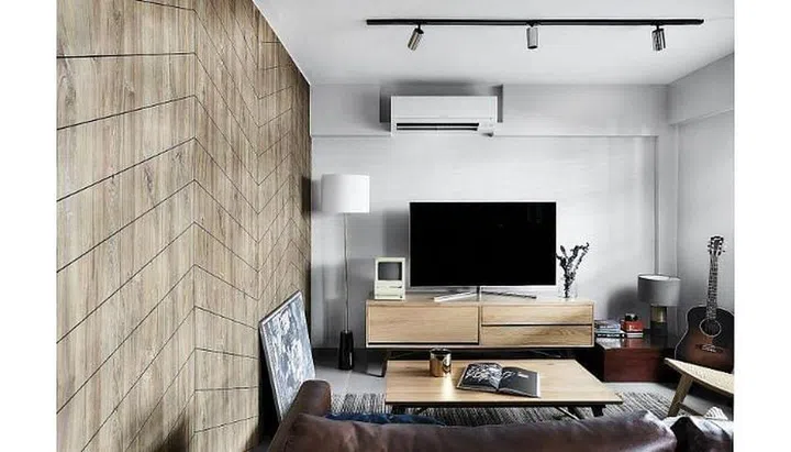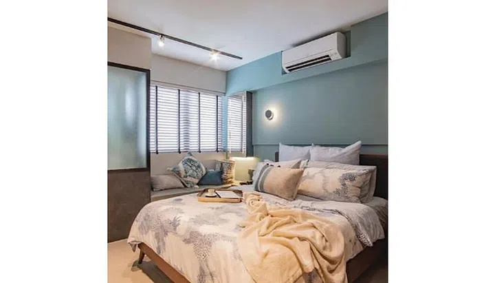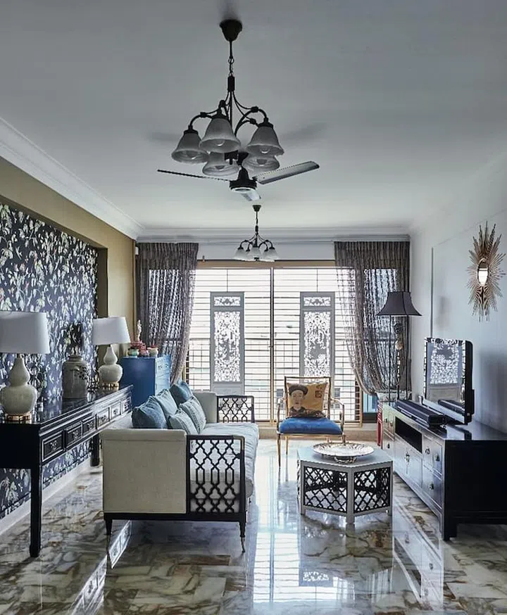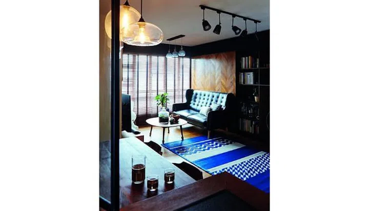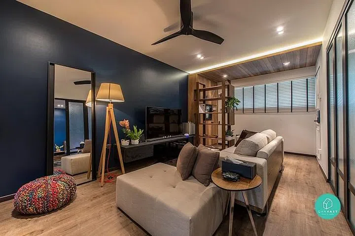 This old resale flat at Towner Road has been transformed into a modern space with a bold blue feature wall and contemporary furnishings.