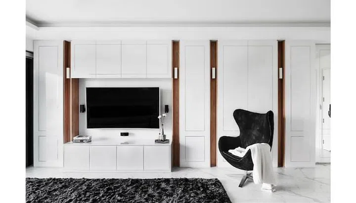 The living room features a predominantly white palette. Built-in cabinets designed like a feature wall run the entire length of the living room to provide storage space that the homeowners needed. The brass inlays on the white laminate cabinet doors were treated to resemble rose gold, adding a touch of glitz that Eileen adores. The original floor tiles were replaced with marble-looking tiles, honed to produce a matte finish. “Raw cement floors can feel gritty and cold on bare feet, but these matte tiles give a warm and furry sensation,” he says.