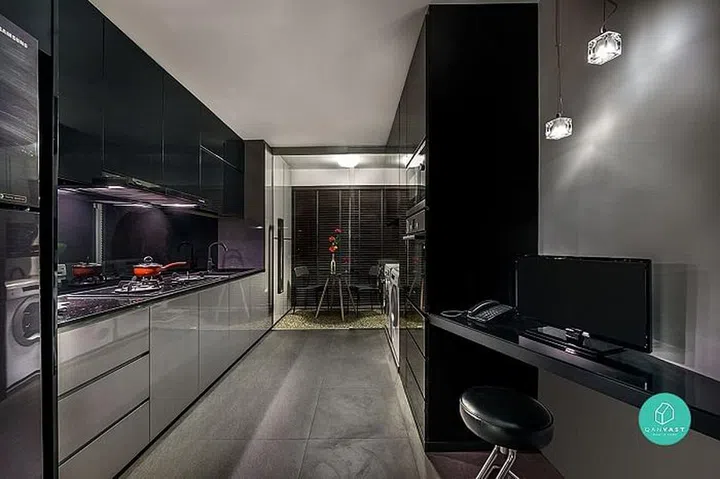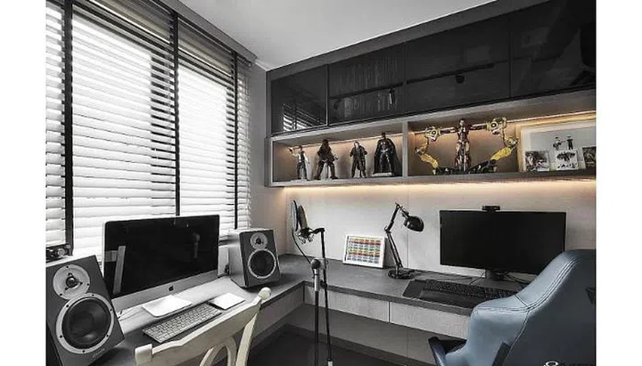 The sleek design of their recording studio is enhanced with contemporary shades of grey. Paired with the leather seats and slick recording equipment, one wouldn’t be able to guess that it is a resale flat from the home interiors.