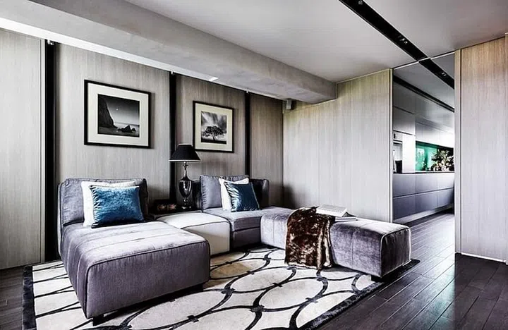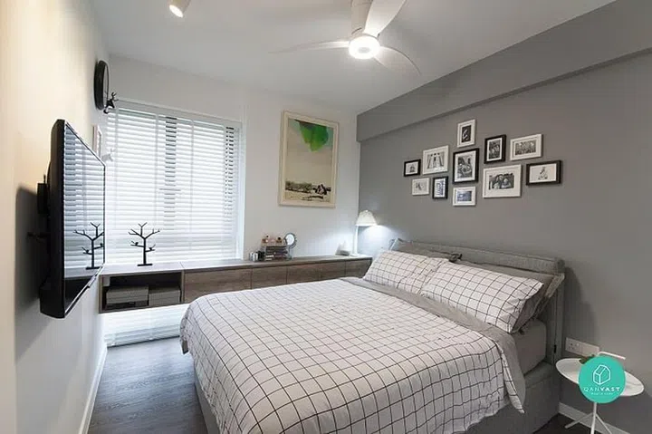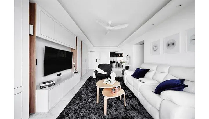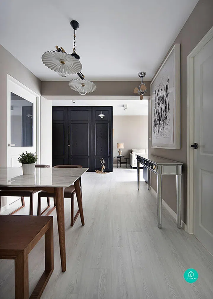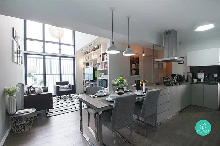 This open-concept HDB features a soothing grey colour scheme and lots of natural light.