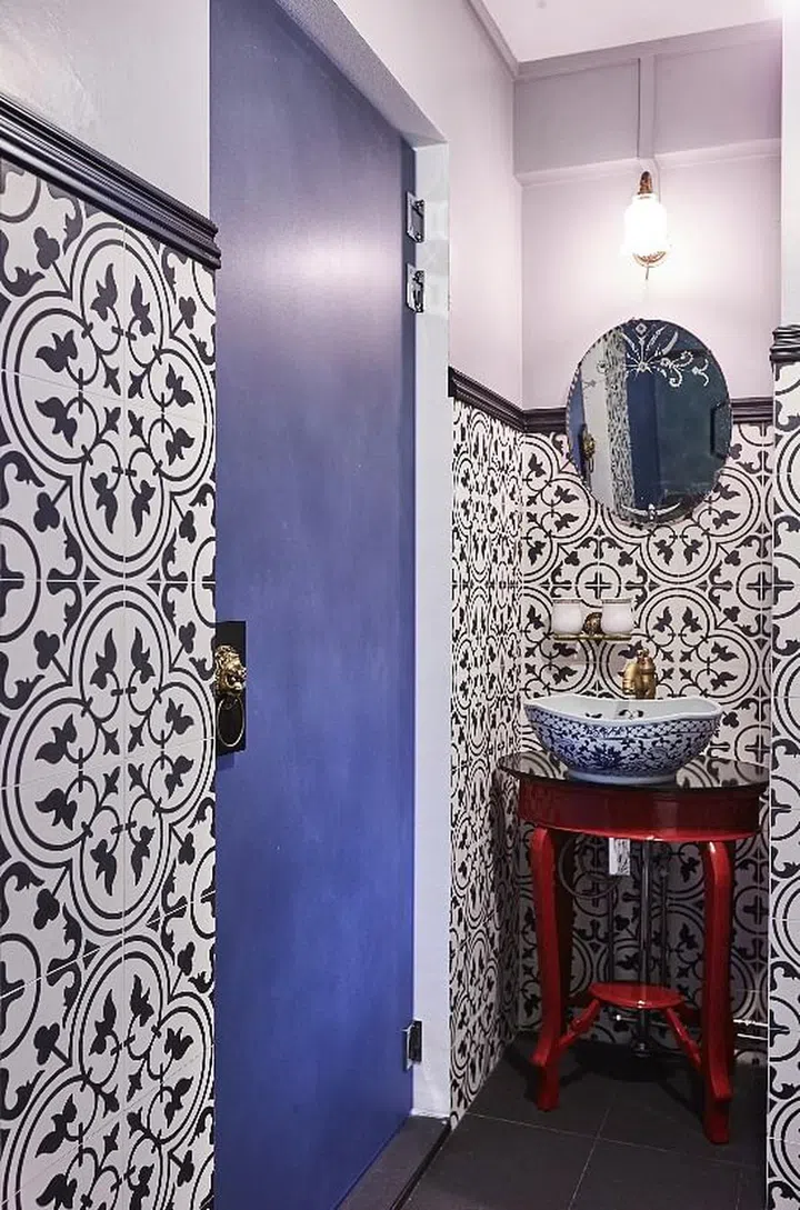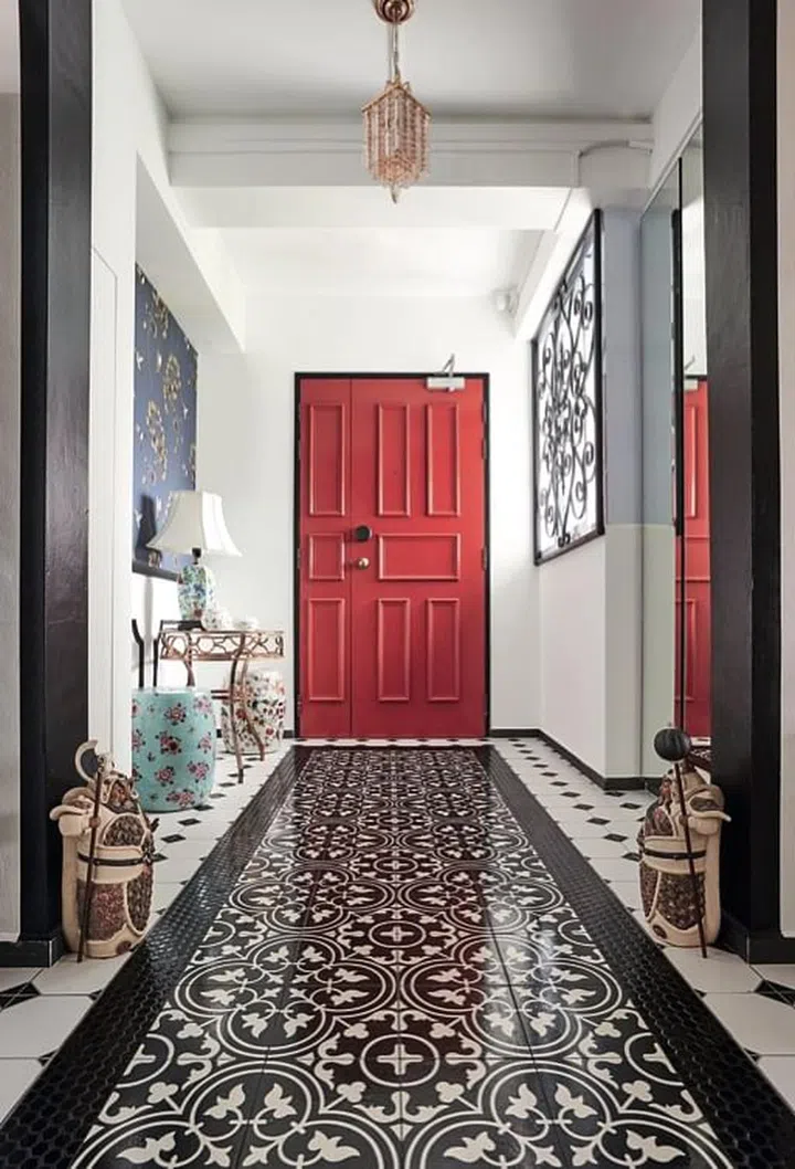 There is incredible detail in every corner of this Chinoiserie-themed five-room flat, which was the result of a collaborative effort between interior designer Trifven Ho from Living Icon and the homeowners, Trish and Jason Yong. The previous owner had bought the corridor space, giving Trifven more space to experiment with various tiles. A splash of red anchors the entryway and complements the oriental decor.