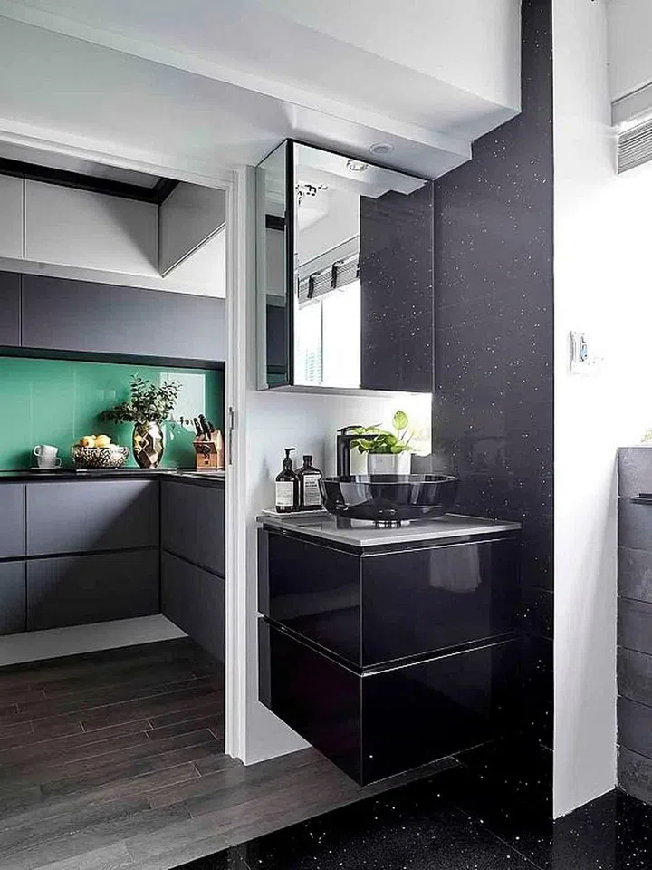 Almost everything in this three-room flat is bespoke, from the patterned rugs and modular sofa – interior designer Adrian Heng flew in a water- and dirt- resistant fabric from Europe for it – to the shade of green used for the kitchen backsplash. He kept to monochromatic hues for the fabrics and accessories, and layered the space with rich textures like velvet and leather.