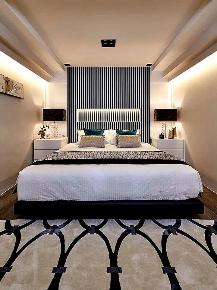 Its white leather wallpaper and customised pillow covers are stylish details that catch the eye, but the real winner of this bedroom is its lighting. As his client loves to read, Adrian incorporated a backlight in the headboard. The cove light imbues the room with warmth, while the dimmable halogen light above the bed is mood lighting.