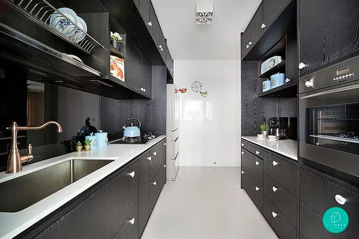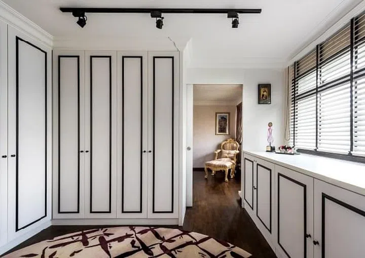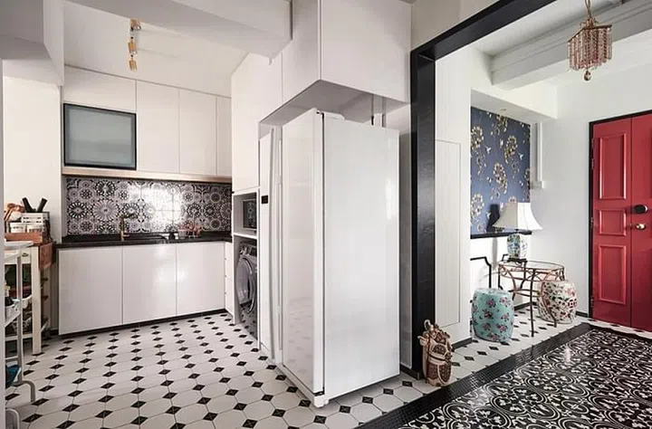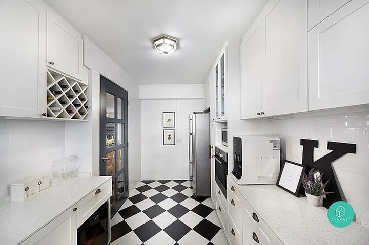 You’ll never guess that this is actually a HDB flat in Punggol. Even the kitchen exudes that British country style, with black and white tiles and recessed panels.