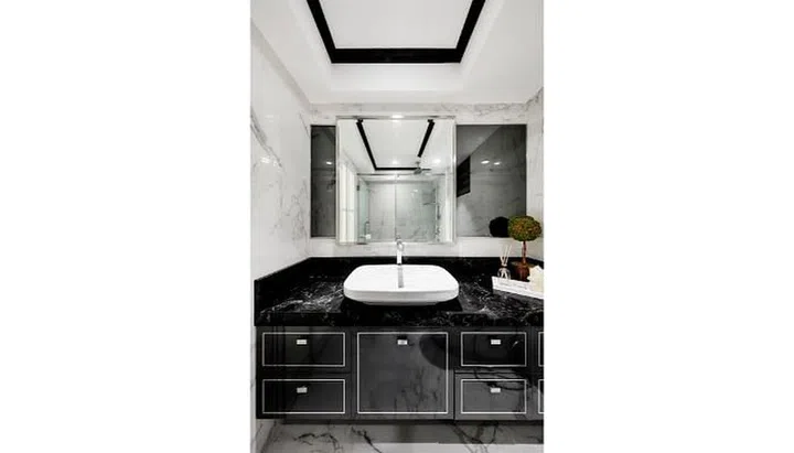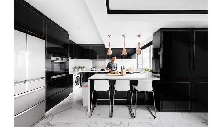 In contrast to the living room’s white palette, the main colour in the kitchen is black to create a more masculine look, complemented by white Caesarstone countertops. The brass inlays on the black laminate cabinet doors use the same design language as the storage cabinets in the living room – albeit in a different colour – providing a sense of connection between the two spaces. Lawrence cladded a bulky rectangular column at the corner of the kitchen with the same brass-on-black finish, harmoniously integrating it into the kitchen scheme.