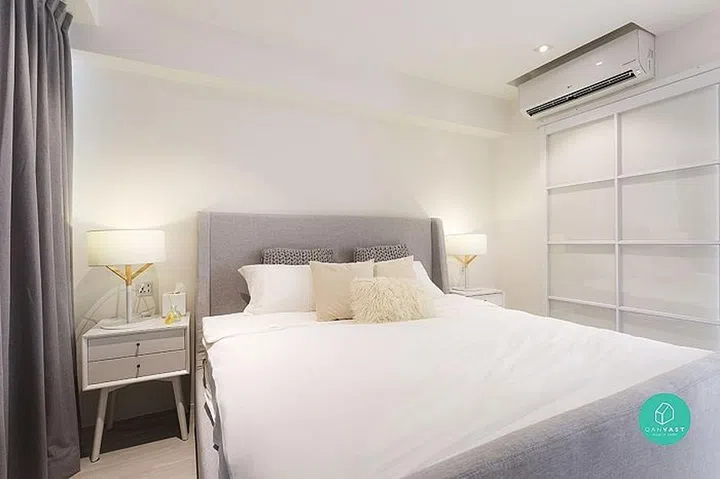 A light grey and white colour scheme makes for a serene bedroom that’s welcoming and refreshing at the same time.