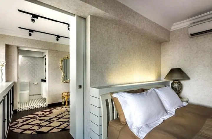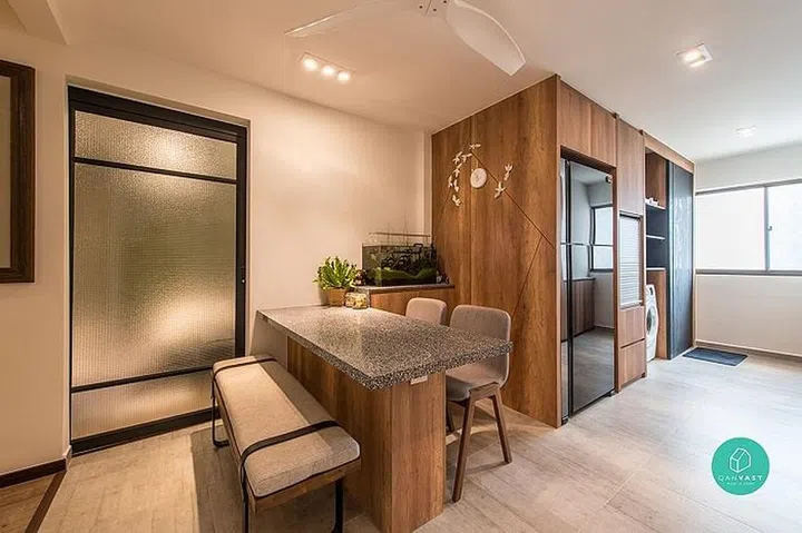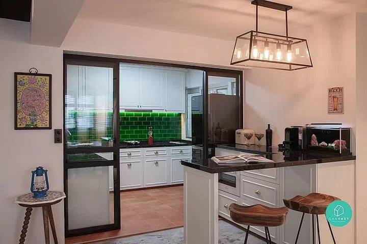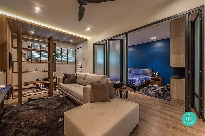 But what makes this flat even more distinct is the lack of conventional walls. Instead, space is demarcated with sliding doors and frosted panels, giving privacy when needed but keeping the home spacious-looking otherwise.