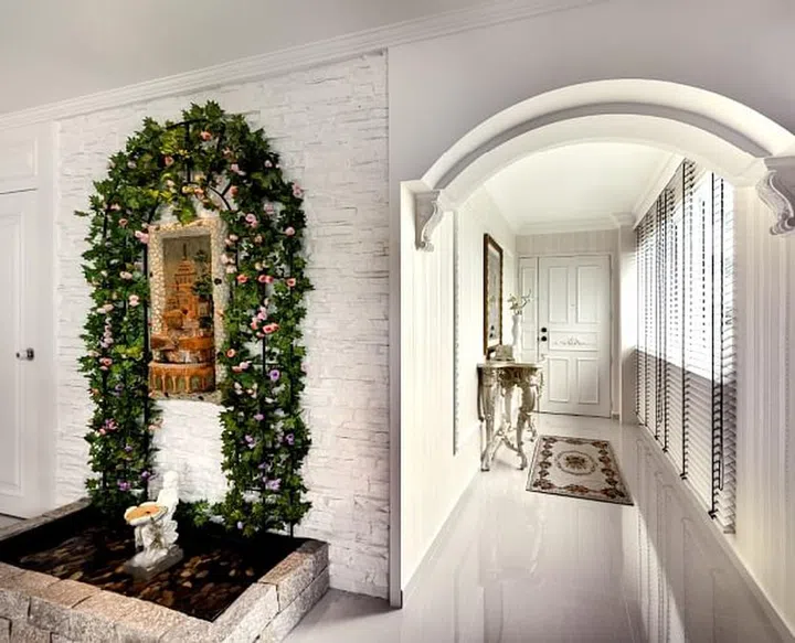 The layout of the 1,400sqf flat allowed for a foyer, with an arch door frame and a customised vintage-look console that sets the scene. As the Victorian era was known for its elaborate gardens, the couple wanted their own, too; a water feature clad in artificial plants and roses was a vibrant addition to the pristine white-gold interiors.