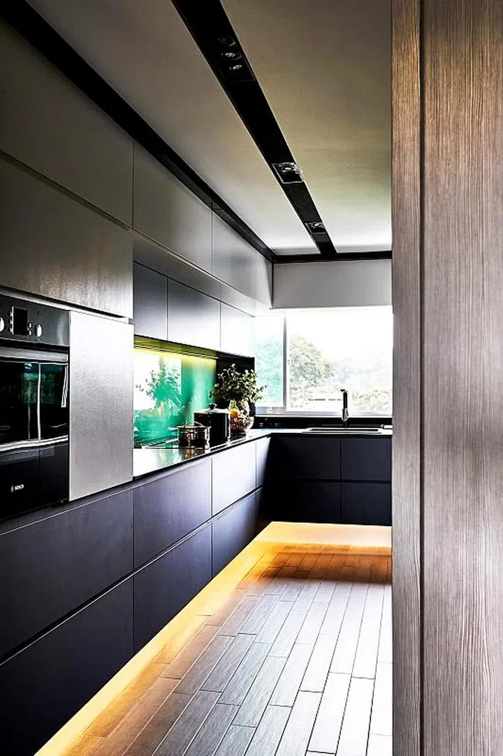 The dark, sleek and modern kitchen is a stark contrast to the living and dining areas.