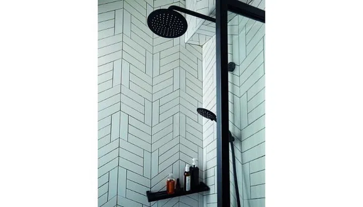 The bathroom is kept minimalist with simple vertical matte-grey tiles and recessed lighting. Check out that minimalist black showerhead too!