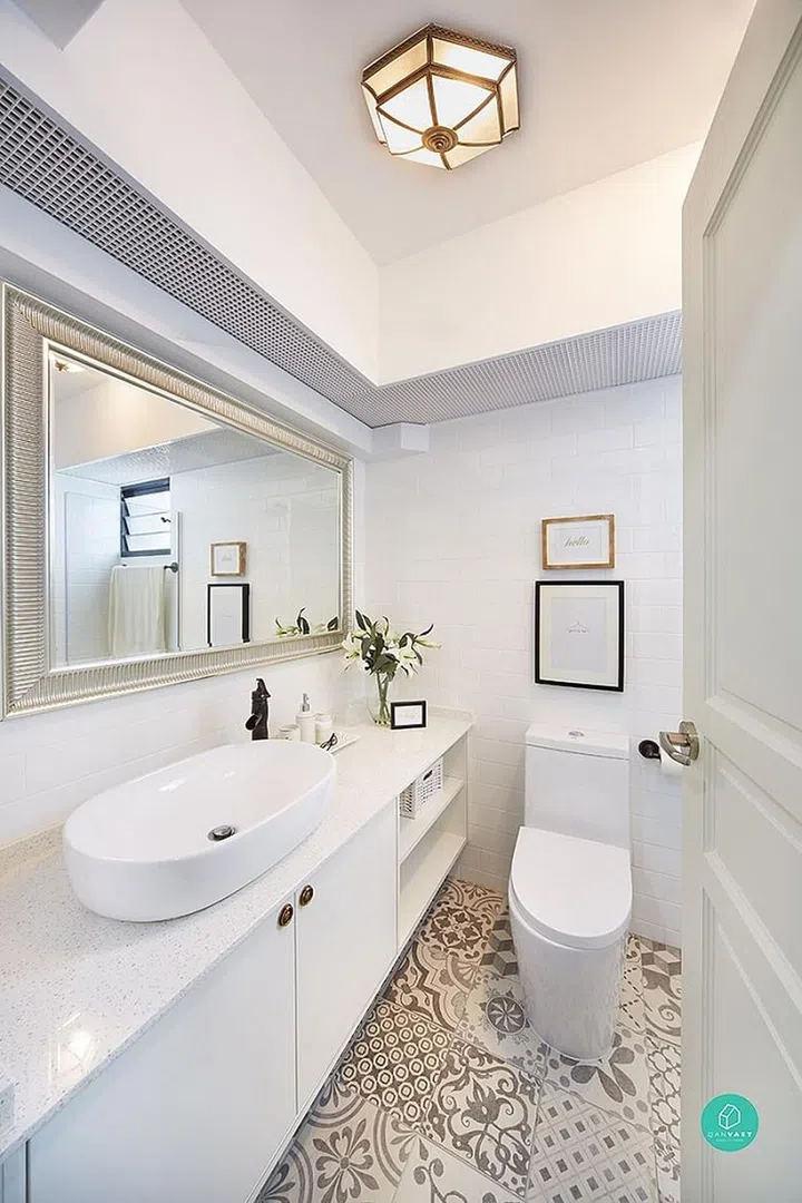 It’s amazing what a bit of interior design can do to a regular bathroom, from the round sink to the mirror and patterned floor tiles.