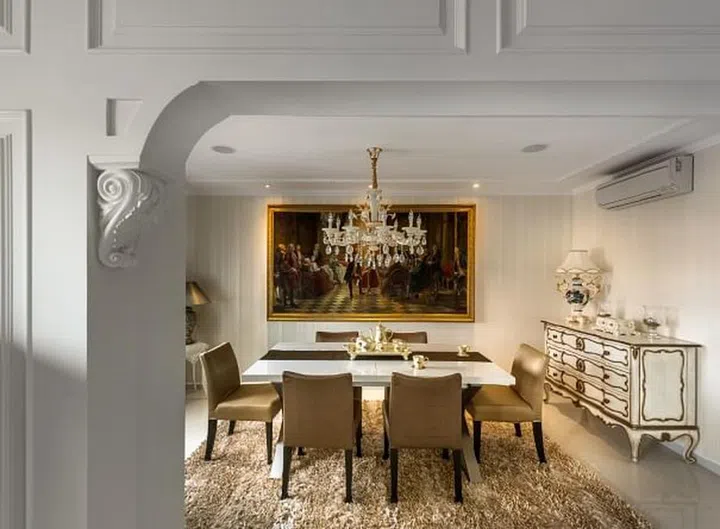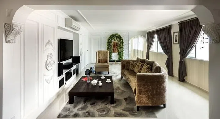 This HDB five-room flat in Hougang was transformed into an intimate, classical abode, thanks to the mastery of interior design firm Three-D Conceptwerke. The homeowners are fond of Victorian-esque interiors – from ornate cornices to dramatic furnishings – and had requested a similarly luxurious, yet modern look.